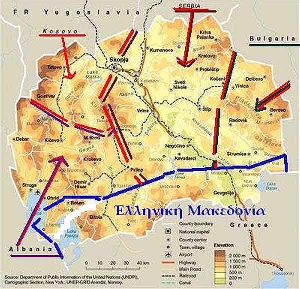 Σε όλα αυτά, για τμήματα εδαφών θα «τρέξουν» η Ελλάδα και η Βουλγαρία, σε ό, τι θα έχει απομείνει από το σλαβικό κρατίδιο των Σκοπίων. Η Ελλάδα έχει δηλωμένο ενδιαφέρον για τα νότια Σκόπια, μέχρι το Μοναστήρι που παλαιότερα πλειοωηφούσε το ελληνικό στοιχείο και μέχρι το 1995 200.000 Σκοπιανοί δήλωναν ότι είναι «ελληνικής συνείδησης»».