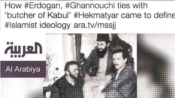 Ένα από τα μεγαλύτερα αραβόφωνα κανάλια, η Al Arabia, δημοσίευσε μια παλιά φωτογραφία που δείχνει τον Ερντογάν να κάθεται στο πάτωμα δίπλα στον γνωστό ισλαμιστή τρομοκράτη, Hikmetyar, χαρακτηρίζοντας τον Τούρκο πρόεδρο σαν μέγα ισλαμιστή τρομοκράτη και αιματοβαμμένο δικτάτορα, δηλαδή πρωτοφανείς βαριές φράσεις κατά του Ερντογάν.