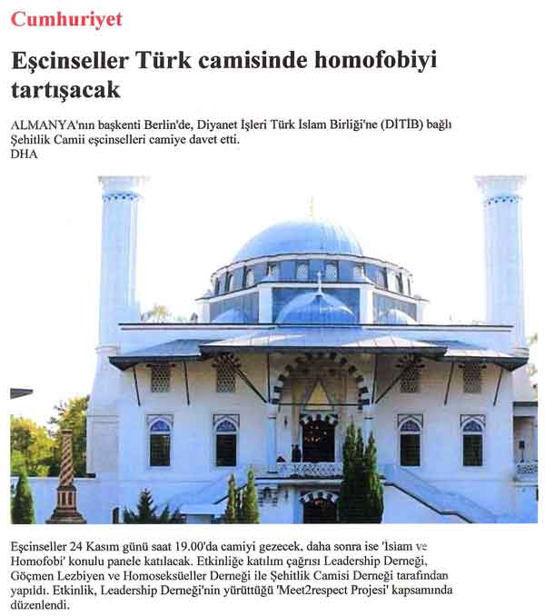Το τούρκο- Ισλάμ και το πανευρωπαϊκό κίνημα υπέρ της επίσημης αναγνώρισης και νομικής κατοχύρωσης των «δικαιωμάτων» των πάσης φύσεως ομοφυλοφίλων, λεσβίων, κ.λπ., διοργάνωσαν σε μια αρμονική συνεργασία και μάλιστα μέσα σε μουσουλμανικό τέμενος στην πρωτεύουσα της Γερμανίας, το Βερολίνο, δημόσια συζήτηση για… την καταπολέμηση της ομοφοβίας.