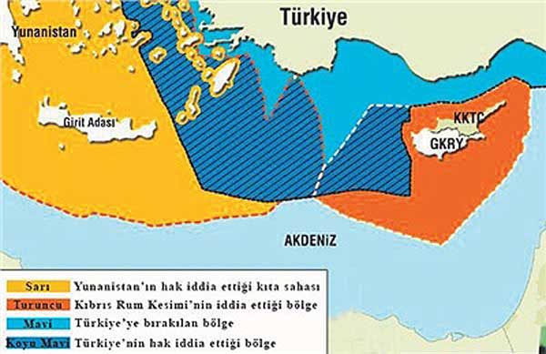 Η Τουρκία θα κινηθεί σύμφωνα με τους αναγκαίους νομικούς , πολιτικούς και οι τεχνικούς κανονισμούς «ΓΙΑ ΝΑ ΛΑΒΕΙ το νόμιμο μερίδιο του υποβρύχιου πλούτου» της περιοχής, καταλήγουν οι Τούρκοι. Δηλαδή ξεκινούν νομικό αγώνα για την διεκδίκηση ΑΟΖ έως κάτω από την Κρήτη και την Κύπρο, ενώ συγχρόνως προετοιμάζονται με όλα τα μέσα, ΠΡΩΤΑ να το « επιβάλουν» σε όλες τις παράκτιες χώρες , συμπεριλαμβανομένης και της Ελλάδος.