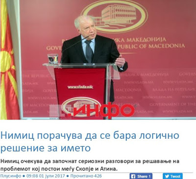 Ο ειδικός αντιπρόσωπος των Ηνωμένων Εθνών στις συνομιλίες μεταξύ της πΓΔΜ και της Ελλάδας, Μάθιου Νίμιτς, επισκέπτεται σήμερα τα Σκόπια για συνομιλίες με ανώτερους αξιωματούχους σχετικά με τις δυνατότητες για την επίλυση της διαφοράς, γράφει το σλαβικό δημοσίευμα των Σκοπίων.