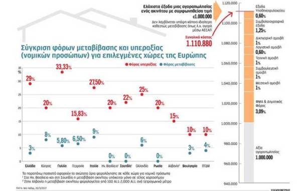 Η μεταβίβαση ακινήτου δεν υπόκειται μόνον στη βάσανο των δικαιολογητικών. Υπάρχει και η φορολογική… Αν και η Ελλάδα παραμένει αρκετά ανταγωνιστική όσον αφορά τον φόρο μεταβίβασης ακινήτων, που είναι από τους χαμηλότερους στην Ευρώπη, και τον φόρο διακράτησης, που κυμαίνεται σε μέσα επίπεδα σε σύγκριση με τις υπόλοιπες χώρες, οι συνολικές δαπάνες για την αγορά ενός ακινήτου είναι πολύ υψηλότερες από ό,τι ο φόρος μεταβίβασης.