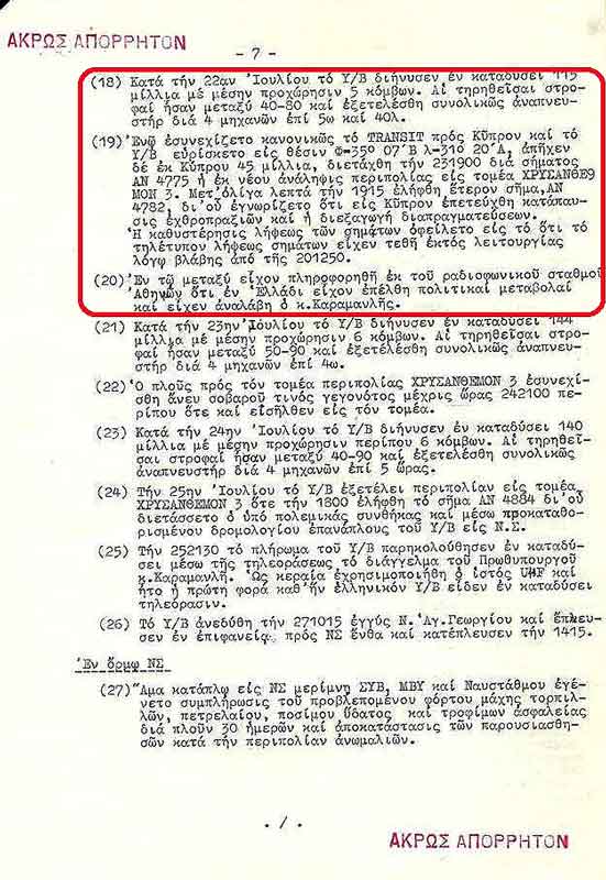 Κατά τον πλουν και εντός του τομέως περιπολίας αποφύγετε εντοπισμόν και εμπλοκήν. 3…» ενώ ακολούθησε και δεύτερο σήμα (ΑΝ 4782) που ενημέρωνε για κατάπαυση εχθροπραξιών. Σύμφωνα με πληροφορίες, ο Κυβερνήτης του ΓΛΑΥΚΟΣ, σοβαρά προβληματισμός από τις παλινωδίες του Αρχηγείου Ναυτικού καθυστέρησε επί 6 ώρες να απαντήσει, καθώς προβληματιζόταν για το τι έπρεπε να πράξει.