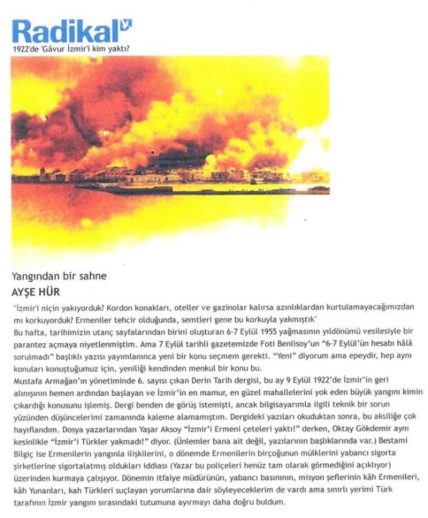 Σύμφωνα λοιπόν με την Τουρκάλα συγγραφέα του μεγάλου αφιερώματος για την καταστροφή της Σμύρνης, η μεγάλη πυρκαγιά άρχισε συγχρόνως σε πολλά σημεία στις 13 Σεπτεμβρίου και μόνο μετά από δυο μέρες τέθηκε μερικώς υπό έλεγχο αφού είχε κάψει μεγάλο μέρος της ελληνικής συνοικίας καθώς και μεγάλα τμήματα της αρμενικής.