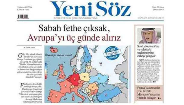 Η φιλοκυβερνητική εφημερίδα Yeni Söz δήλωσε γράφει σήμερα στο πρωτοσέλιδό της ότι “η Τουρκία μπορεί να κατακτήσει την Ευρώπη μέσα σε τρεις ημέρες” !!!