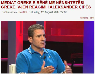 Ο δημοσιογράφος Αλεξάντερ Τσίπα (Aleksandër Çipa), ο οποίος είναι επικεφαλής της Ένωσης Αλβανών Δημοσιογράφων (UGSH), αντέδρασε σε άρθρο που δημοσιεύθηκε σε ελληνική εφημερίδα.