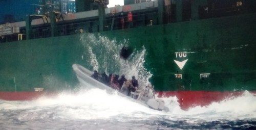Η φωτογραφία είναι άκρως ενδεικτική της βιαιότητας των κυμάτων που μπορεί να συναντήσει ένα ταχύπλοο που πλέει στα απόνερα ενός μεγάλου πλοίου (με κύματα τα οποία στην κυριολεξία ανυψώνουν την πλώρη στον αέρα) απαιτώντας επιδέξιους ελιγμούς από το χειριστή της λέμβου!