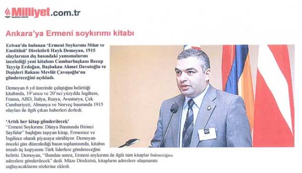 Σύμφωνα με τις δημοσιογραφικές πληροφορίες από την Τουρκία o διευθυντής του «Αρμενικού Ινστιτούτου και Μουσείου» της αρμενικής γενοκτονίας, Hayk Demoyan, ανακοινώσε ότι θα εκδώσουν ένα καινούργιο τόμο που θα περιγράφει με αποκλειστικές λεπτομέρειες και αδιάσειστες ιστορικές αποδείξεις την φρικτή γενοκτονία που υπέστησαν οι Αρμένιοι.