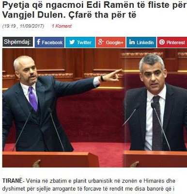 «Σε αυτήν την περιοχή έχει αναπτυχθεί μια εντελώς φυσιολογική και ολοκληρωμένη διαδικασία. Σε αυτήν δεν υπάρχει κανένα ενδιαφέρον, έχω πει και επαναλαμβάνω σε όλους τους ενδιαφερομένους, ακόμη και στον Βαγγέλη Ντούλε, ο οποίος δεν γνωρίζω σε ποιο κόμμα είναι τώρα (…). Φέρτε ένα ενιαίο έγγραφο που να δείχνει ότι υπάρχει μια ασύμμετρη δράση σε αυτήν την περιοχή από αυτό που συμβαίνει στην Τροπόγια (βόρειο Αλβανία- σύνορα με Κόσοβο) και στην Κονίσπολη (νότια Αλβανία, σύνορα με Ελλάδα), είπε ο Ράμα, σύμφωνα με το δημοσίευμα. πηγη