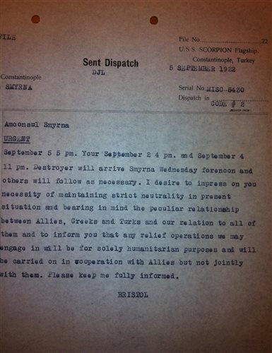 Τηλεγράφημα στο αμερικανικό προξενείο της Σμύρνης από την Κωνσταντινούπολη το οποίο συστήνει «αυστηρή ουδετερότητα»