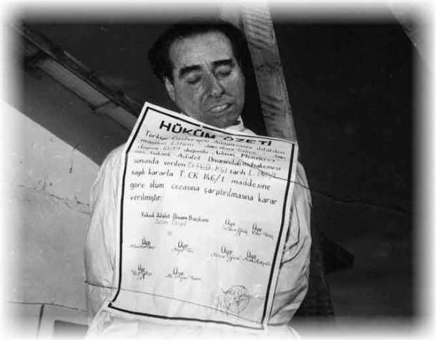 Μετά την ετυμηγορία του δικαστηρίου, ο Menderes απαγχονίστηκε στο νησί Imrali στη Θάλασσα του Μαρμαρά μετά από δίκη ενός χρόνου.