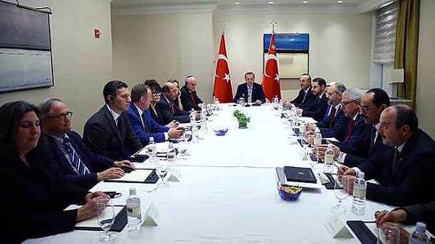 Όπως και πριν από ένα χρόνο όταν ο Ερντογάν είχε πάει στις ΗΠΑ και είχε συναντηθεί με τον Κίσινγκερ και εκπροσώπους της οικογένειας Ρότσλντ, έτσι και τώρα ο Τούρκος πρόεδρος με τους πρώτους που συναρτήθηκε στις Ηνωμένες Πολιτείες ήταν οι εκπρόσωποι του Εβραϊκού Συμβουλίου, μια πανίσχυρη οργάνωση του εβραϊκού λόμπι στις ΗΠΑ.