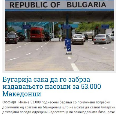 Υπάρχουν, ήδη, 53 χιλιάδες νέες αιτήσεις με συνημμένα απαιτούμενα έγγραφα (ότι είναι Βούλγαροι) από πολίτες του κράτους των Σκοπίων που έχουν ορισμένα προβλήματα στο να γίνουν Βούλγαροι πολίτες, εξαιτίας κάποιων ελλείψεων στο νομοθετικό πλαίσιο, όπως αναφέρει το σλαβο-σκοπιανό πρακτορείο ‘meta’, που επικαλείται τον Βούλγαρο αναπληρωτή πρωθυπουργό Βαλέρι Σιμεμόνοφ.