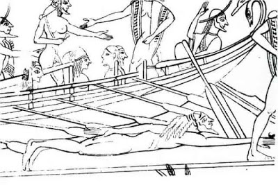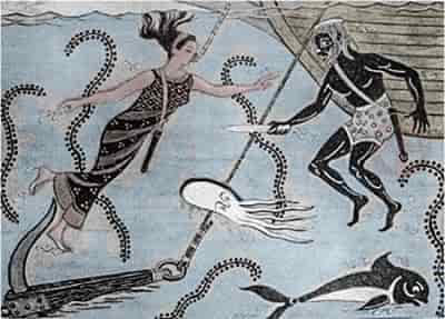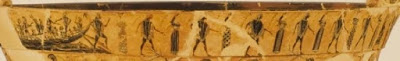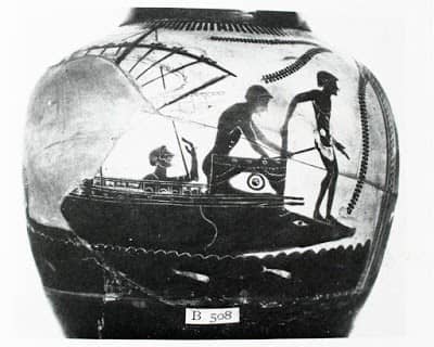 Χαρακτηριστικό παράδειγμα δύναται να αποτελέσει γνωστό αττικό αγγείο (570 π.Χ.) ζωγραφισμένο από τον Κλειτία (σχ. 1) πάνω στο οποίο μπορούμε να ξεχωρίσουμε ανάμεσα σε πολλές σκηνές, λεπτομέρεια από το ταξίδι του Θησέως στην Κρήτη.
