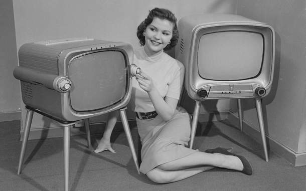 Στη φωτογραφία, η μις Ιλινόις του 1955 Dianne Daniggelis παρουσιάζει το νέο θαύμα της αμερικανικής βιομηχανίας, τις φορητές ελαφρές συσκευές τηλεόρασης Zenith, με οθόνη 17 ιντσών.