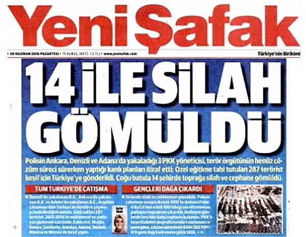 Σύμφωνα με την τουρκική φιλοκυβερνητική εφημερίδα Yeni Şafak, το κουρδικό ΡΚΚ με την στόχευση να επεκτείνει τις πολεμικές του επιχειρήσεις σε όλη την έκταση της Τουρκίας έχει οργανώσει ήδη σε δεκατέσσερις επαρχίες ολόκληρα κρυφά οπλοστάσια, τα κρησφύγετα των οποίων ερευνά η τουρκική Στρατοχωροφυλακή. Μάλιστα σύμφωνα με την εφημερίδα Sabah, στα οπλοστάσια αυτά βρίσκονται 80.000 όπλα.