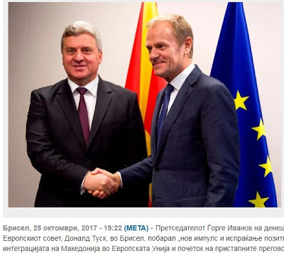 Ο πρόεδρος των Σκοπίων, Γκιόργκε Ιβάνοφ στη συνάντηση που είχε στις Βρυξέλλες με τον πρόεδρο του Ευρωπαϊκού Συμβουλίου, Ντόναλντ Τουσκ, ζήτησε μια «νέα δυναμική και να στείλει ένα θετικό μήνυμα» να αποδεσμευθεί η ένταξη των Σκοπίων στην Ευρωπαϊκή Ένωση και να αρχίσουν οι ενταξιακές διαπραγματεύσεις.