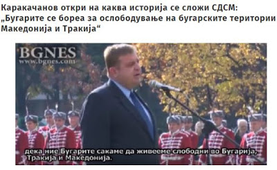 Οι δηλώσεις του Βούλγαρου υπουργού Άμυνας, Κρασιμίρ Καρακατσάνοφ που έγιναν με αφορμή αγιασμού για την αποκατάσταση του μνημείου για τους πεσόντες της Βουλγαρίας του Αγίου Στεφάνου, ερέθισαν τους Σκοπιανούς, οι οποίοι σε αρκετές ιστοσελίδες αναφέρονται στο θέμα στο οποίο τονίζουν ότι το βουλγαρικό κράτος για το οποίο μιλά ο Καρακατσάνοφ (της Συνθήκης του Αγίου Στεφάνου) περιελάμβανε και όλο το νυν κράτος των Σκοπίων.