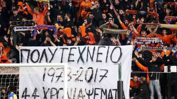 Στο ντέρμπι της Κύπρου κόντρα στην Ομόνοια (ομάδα ταυτισμένη με την Αριστερά και το κάψιμο της Ελληνικής σημαίας), όπου το ΑΠΟΕΛ επικράτησε με 3-1, οι οπαδοί των νικητών ύψωσαν πανό το οποίο έγραφε: «ΠΟΛΥΤΕΧΝΕΙΟ. 1973-2017. 44 ΧΡΟΝΙΑ ΨΕΜΑΤΑ».