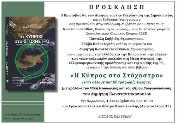 με αφορμή την έκδοση του νέου βιβλίου «Η Κύπρος στο Στόχαστρο»Γιατί θέλουν μια Κύπρο χωρίς Έλληνες(με πρόλογο του Μίκη Θεοδωράκη και του Θέμου Στοφορόπουλου)