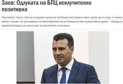Ο πρωθυπουργός Ζόραν Ζάεφ εξέφρασε την ικανοποίησή του για την απόφαση της Βουλγαρικής Ορθόδοξης Εκκλησίας να οδηγήσει και να βοηθήσει όλη τη διαδικασία αναγνώρισης της αυτοκέφαλης Ορθόδοξης Εκκλησίας των Σκοπίων- Αρχιεπισκοπής Οχρίδας και την αξιολόγησε ως ‘εξαιρετικά θετική’.