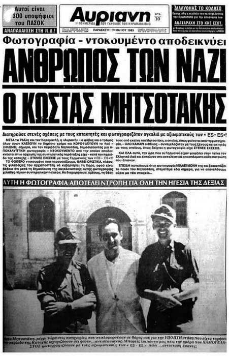 Ένα μήνα περίπου πριν τις εκλογές (στις 10 του Μάη) η εφημερίδα «Αυριανή», δημοσιεύει μια φωτογραφία του Μητσοτάκη ανάμεσα σε δυο ναζί στρατιώτες κατηγορώντας τον ευθέως πως ήταν συνεργάτης των κατακτητών.
