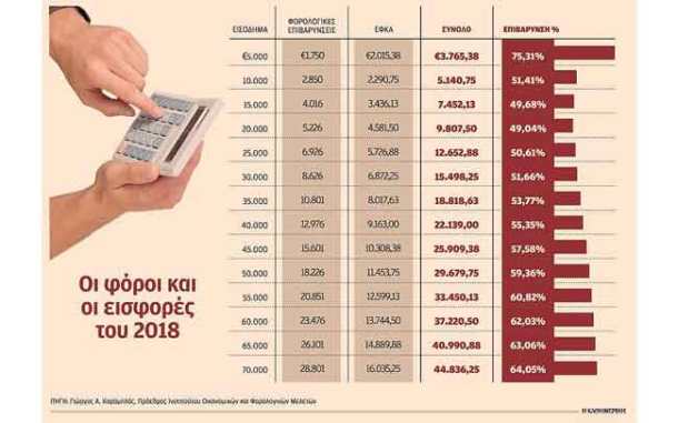 Εάν το ετήσιο εισόδημα ανέλθει στις 25.000 ευρώ, η εφορία και ο ΕΦΚΑ θα πάρουν το 50,61% του εισοδήματος. Οσο αυξάνεται το εισόδημα, τόσο διογκώνονται και οι επιβαρύνσεις, και συγκεκριμένα για εισόδημα 70.000 το κράτος υφαρπάζει το 64,05% του εισοδήματος.