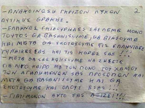 Οι «Γκρίζοι Λύκοι» απειλούν τους Έλληνες «γκιαούρηδες» της Δυτικής Θράκης πώς θα βιάσουν τις γυναίκες τους και θα σκοτώσουν τα παιδιά τους και εν συνεχεία θα επιστρέψουν να δολοφονήσουν τους ίδιους σε ένα άκρως εθνικιστικό παραλήρημα που «κάρφωσαν» με την μορφή σημειώματος στις στάσεις των λεωφορείων της Κομοτηνής.