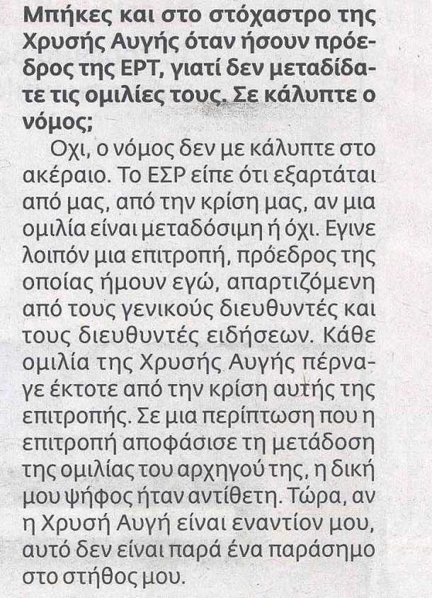 Αυτό που δεν είπε, αλλά το συμπεραίνει κανείς εύκολα, είναι ότι όταν πλέον το πολιτικό κόστος έγινε αφόρητο, αποφασίστηκε οι εργατοπατέρες να αναλάβουν την λογοκρισία, μέσω της γνωστής παράνομης και επιλεκτικής στάσης εργασίας που πραγματοποιούν κάθε φορά που είναι να προβληθεί η Χρυσή Αυγή.