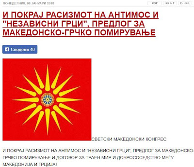 Το Παγκόσμιο Συνέδριο των (Σλάβο)μακεδόνων (WMC) απορρίπτει με αγανάκτηση ως ρατσιστικές τις δηλώσεις του Μητροπολίτη Άνθιμου ότι «η Μακεδονία σημαίνει Ελλάδα και Ελλάδα σημαίνει Μακεδονία» καθώς και τη δήλωση της υπουργού Μακεδονίας Θράκης, Μαρίας Κόλια – Τσαρουχά από τις τάξεις των «Ανεξάρτητων Ελλήνων» ότι η «Μακεδονία είναι ελληνική και η Μακεδονία είναι Ελλάδα» κατά τον αγιασμό των υδάτων, ρίχνοντας το σταυρό στο Λευκό Πύργο στη Θεσσαλονίκη, με την ευκαιρία των Θεοφανείων που γιόρταζε η Ελλάδα.