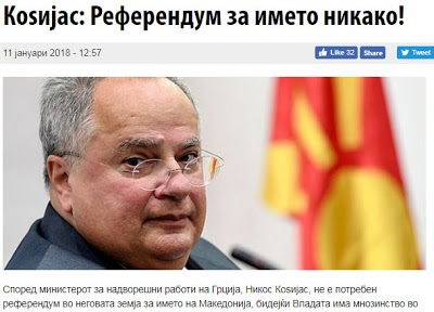 Σύμφωνα με τον υπουργό Εξωτερικών της Ελλάδας, Νίκο Κοτζιά, γράφει η σλαβική εφημερίδα ‘Βέτσερ’, δεν απαιτείται δημοψήφισμα στη χώρα του για το όνομα των Σκοπίων, καθώς η κυβέρνησή του έχει πλειοψηφία στο Κοινοβούλιο, ενώ ταυτόχρονα προτρέπει στο βόρειο γείτονα να μην κάνει δημοψήφισμα.