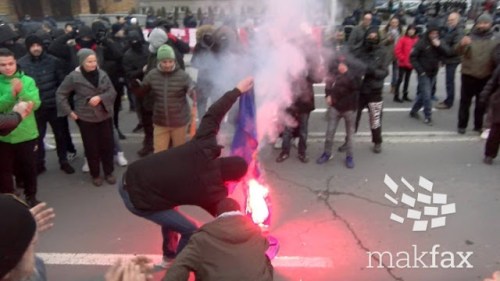 Οι διαμαρτυρόμενοι συγκεντρώθηκαν μπροστά από το κτήριο του κοινοβουλίου στα Σκόπια και διαδήλωσαν ειρηνικά, παρά του ότι έκαψαν τη σημαία της ΕΕ, σημειώνει η σερβική ραδιοτηλεόραση.
