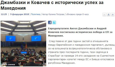 «Πρόκειται για μια εξαιρετική επιτυχία, που, παρά την αντίσταση των Ελλήνων αντιπροσώπων στο Ευρωπαϊκό Κοινοβούλιο- μέλη της επιτροπής επιβεβαίωσαν χωρίς αμφισβήτηση τις φιλοδοξίες της πΓΔΜ για καλές σχέσεις γειτονίας στην πορεία προς την ΕΕ και το ΝΑΤΟ», σημειώνει το βουλγαρικό δημοσίευμα. πηγη