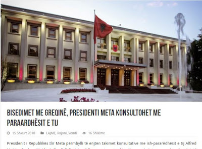 Ο πρόεδρος της Δημοκρατίας, Ιλίρ Μέτα, ολοκλήρωσε τις συμβουλευτικές συνεδριάσεις την Πέμπτη με τους πρώην προέδρους :Άλφρεντ Μοϊσίου. Ρετζέπ Μεϊντάνι και Σαλί Μπερίσα, σχετικά με τα θέματα των διαπραγματεύσεων μεταξύ της Αλβανίας και της Ελλάδα που αναμένεται, επίσημα, να πραγματοποιηθούν.
