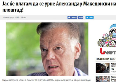 Ο Μίροσλάβα Γκάρτσεφ, μέλος του Συμβουλίου Πολιτισμού του SDSM, ο οποίος πριν από μερικούς μήνες είχε δηλώσει στα σερβικά ΜΜΕ ότι η «Μακεδονία» και το «μακεδονικό έθνος» εφευρέθηκαν από τον Τίτο, είναι μέλος της Επιτροπής αξιολόγησης των έργων που στήθηκαν σε δημόσιους χώρους από την κυβέρνηση του Νίκολα Γκρούεφσκι.