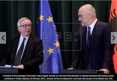 Ο πρόεδρος της Ευρωπαϊκής Επιτροπής Ζαν Κλον Γιουγκέρ ενθάρρυνε σήμερα(χθες) την Αλβανία να συνεχίσει τις αναγκαίες μεταρρυθμίσεις, ώστε οι Βρυξέλλες να συστήσουν την έναρξη των διαπραγματεύσεων προσχώρησης στην Ευρωπαϊκή Ένωση στην έκθεσή της τον Απρίλιο.