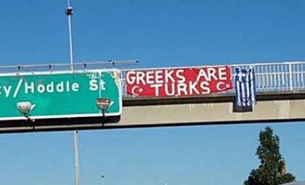 Μια καυστική και άκρως ανθελληνική έκπληξη περίμενε τους οδηγούς στην εθνική οδό Geelong στην Μελβούρνη της Αυστραλίας, καθώς επάνω σε μια αερογέφυρα κάποιοι είχαν κρεμάσει μια τουρκική σημαία με το σλόγκαν ότι οι Έλληνες είναι… Τούρκοι, με την έννοια ότι είναι υποτελείς των Τούρκων, γεγονός που έχει θορυβήσει την ελληνική κοινότητα της Μελβούρνης.