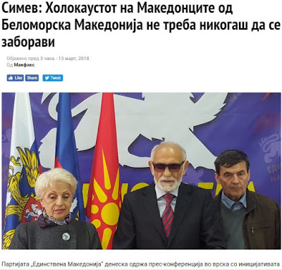 Το κόμμα της «Μοναδικής Μακεδονίας» πραγματοποίησε συνέντευξη Τύπου καλώντας την κυβέρνηση να τιμήσει και το Ολοκαύτωμα (αφού τίμησε το Ολοκαύτωμα των Εβραίων) της ‘Μακεδονίας’ με τα 32 χιλιάδες παιδιά των «Μακεδόνων» (Σλάβων) από τη «Μακεδονία» της Λευκής Θάλασσας (Αιγαίο) το 1948.