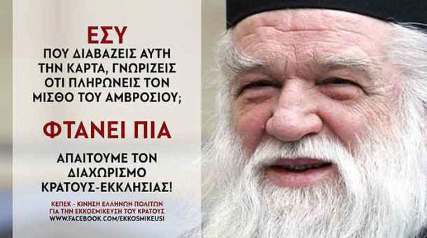 Επίσης η αυτοαποκαλούμενη ΚΕΠΕΚ – Κίνηση Ελλήνων Πολιτών για την Εκκοσμίκευση του Κράτους που πολλάκις έχει ασχοληθεί με την Εκκλησιαστική Περιουσία και τη Μισθοδοσία του Κλήρου βγάζει κι εκείνη την χολή της με την παρακάτω αφίσα: