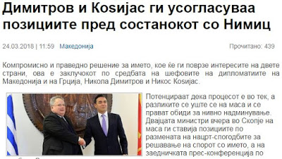 Ο συμβιβασμός και η δίκαιη λύση για το όνομα, που θα συνδέσει τα συμφέροντα και των δύο πλευρών, είναι το συμπέρασμα μετά τη συνάντηση των ΥΠΕΞ Σκοπίων και Ελλάδας, Νίκολα Ντιμίτροφ και Νίκου Κοτζιά.