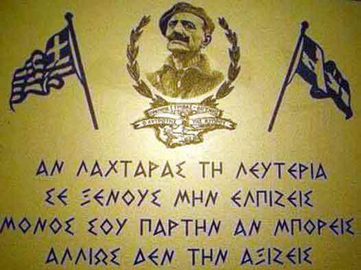 «Μέ τήν βοήθειαν τοῦ Θεοῦ, µέ πίστιν εἰς τόν τίµιον ἀγῶνα µας, µέ τήν συµπαράστασιν ὁλοκλήρου τοῦ Ἑλληνισµοῦ καί µέ τήν βοήθειαν τῶν Κυπρίων ΑΝΑΛΑΜΒΑΝΟΜΕΝ ΤΟΝ ΑΓΩΝΑ ΔΙΑ ΤΗΝ ΑΠΟΤΙΝΑΞΙΝ ΤΟΥ ΑΓΓΛΙΚΟΥ ΖΥΓΟΥ, µέ σύνθηµα ἐκεῖνο, τό ὁποῖον µᾶς κατέλιπαν οἱ πρόγονοί µας ὡς ἱεράν παρακαταθήκην: ‘Ἤ ΤΑΝ ‘Ἤ ΕΠΙ ΤΑΣ».