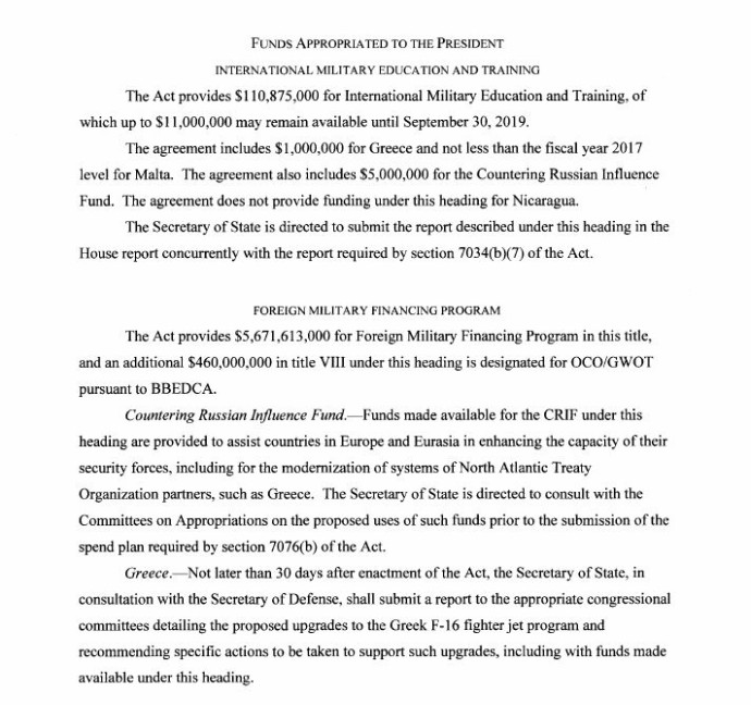 «Αυτή η προτεινόμενη πώληση θα συμβάλει στην επίτευξη των στόχων εξωτερικής πολιτικής και εθνικής ασφάλειας των ΗΠΑ, συμβάλλοντας στη βελτίωση της ασφάλειας ενός συμμάχου του ΝΑΤΟ που αποτελεί σημαντικό εταίρο για την πολιτική σταθερότητα και την οικονομική πρόοδο στην Ευρώπη. Η αναβάθμιση των αεροσκαφών F-16 σε F-16 Block V θα ενισχύσει την ικανότητα της Ελληνικής Πολεμικής Αεροπορίας να υποστηρίζει το ΝΑΤΟ και να παραμείνει διαλειτουργική με τις ΗΠΑ και τη συμμαχία. Θα βοηθήσει επίσης την Ελλάδα να διατηρήσει τις επιχειρησιακές δυνατότητές της στο μέλλον, μειώνοντας έτσι την απειλή που δημιουργούν οι εχθροί της συμμαχίας στις ΗΠΑ και στο NATO», αναφέρει το έγγραφο.