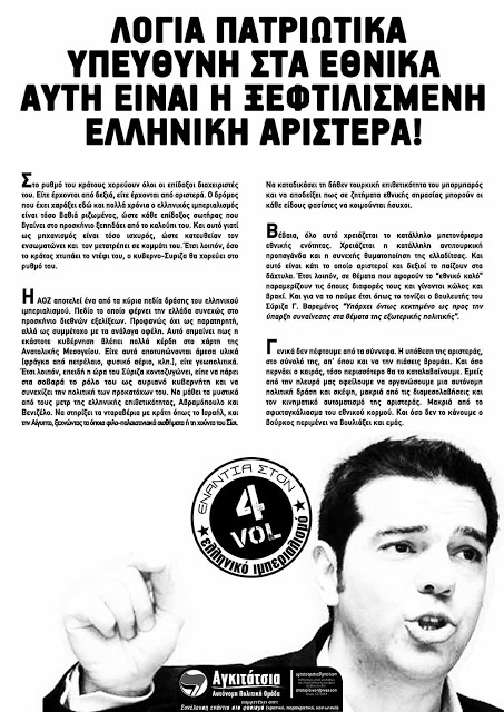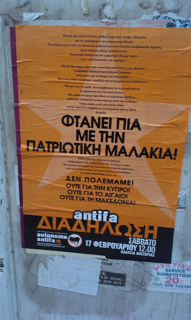 Ο καθένας βέβαια έχει το δικαίωμα να υποστηρίζει μια τρέλα, ωστόσο εδώ γεννάται το εξής ερώτημα: —Ποιος είναι δυνατόν να χρηματοδοτεί αφίσες που μιλούν για παράδοση των νησιών μας στους Τούρκους, ή για παραχώρηση της Μακεδονίας, εν συνόλω, στους Σκοπιανούς;