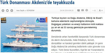 «Στις ακτές της Τουρκίας και στην Ανατολική Μεσόγειο, το ‘Ισλαμικό κράτος’ και ο Άσαντ, έχουν μετατραπεί σε οπλοστάσιο δικαιολογιών για την παρουσία πολεμικών πλοίων. Το βασικό σημείο των κοιτασμάτων φυσικού αερίου στην περιοχή περιβάλλεται τώρα από τουλάχιστον 33 πολεμικά πλοία.