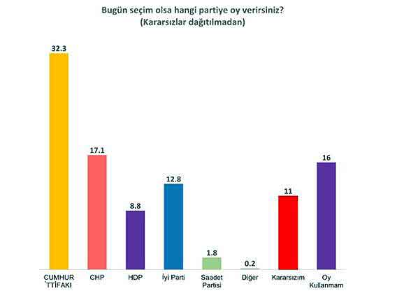 Οι αναποφάσιστοι, Kararsız, είναι 11% και απέχοντες, Oy kulamnmam, 16%.