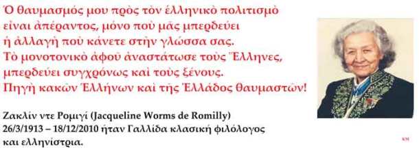 Η Ζακλίν Ντε Ρομιγί, η μεγάλη Γαλλίδα ελληνίστρια, έφυγε από τη ζωή το 2010 πλήρης ημερών, αφήνοντας πίσω της ένα πλουσιότατο και σημαντικότατο έργο, και για μας τους Έλληνες ιδιαιτέρως τιμητικό.