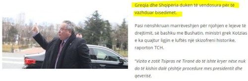 Μόλις υπέγραψε τη συμφωνία για την αναγνώριση των αδειών οδήγησης με τον Ντιτμίρ Μπουσάτι, ο Έλληνας υπουργός Νίκος Κοτζιάς αποκάλεσε την εμπόλεμη κατάσταση με την Αλβανία ως μια ιστορική σχιζοφρένεια, γράφει το αλβανικό δημοσίευμα.