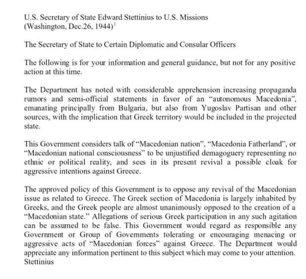 «Τον Δεκέμβριο του 1944 τηλεγράφημα του State Department προς αμερικανικές Αρχές, με υπογραφή του τότε αμερικανού Υπουργού Εξωτερικών Stettinius, έγραφε, μεταξύ άλλων, ότι: «Η (αμερικανική) Κυβέρνηση θεωρεί ότι αναφορές του τύπου μακεδονικό «έθνος», μακεδονική «Μητέρα Πατρίδα» ή μακεδονική «εθνική συνείδηση» αποτελούν αδικαιολόγητη δημαγωγία που δεν αντικατοπτρίζει καμία πολιτική πραγματικότητα και βλέπει σε αυτές την αναγέννηση ενός πιθανού μανδύα που θα υποκρύπτει επιθετικές βλέψεις εναντίον της Ελλάδας».