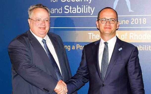 Θερμή χειραψία των υπουργών Εξωτερικών Ελλάδας και Αλβανίας Ν. Κοτζιά και Ντιτμίρ Μπουσάτι κατά τη χθεσινή συνάντησή τους στην τρίτη διάσκεψη για τη σταθερότητα και την ασφάλεια, στη Ρόδο.