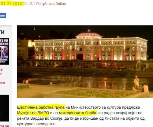 Μια εξαμελής ομάδα εργασίας του Υπουργείου Πολιτισμού πρότεινε να διαγραφεί από τον κατάλογο των αντικειμένων της Πολιτιστικής Κληρονομιάς, το (προπαγανδιστικό) Μουσείο της Εσωτερικής Μακεδονικής Επαναστατικής Οργάνωσης (VMRO) και του Μακεδονικού Αγώνα, που κτίσθηκε δίπλα από την αποβάθρα του ποταμού Βαρδάρη στα Σκόπια.